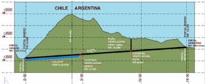 - Ventilación sanitaria para operación normal y sistema de ventilación para extracción de humos de incendio. Pozo vertical de ventilación en territorio argentino de 535 m. de altura de excavación y 4,5 m. de diámetro interno. Galería de ventilación en territorio chileno de 4,75 km de largo y 36 m2 de sección transversal.